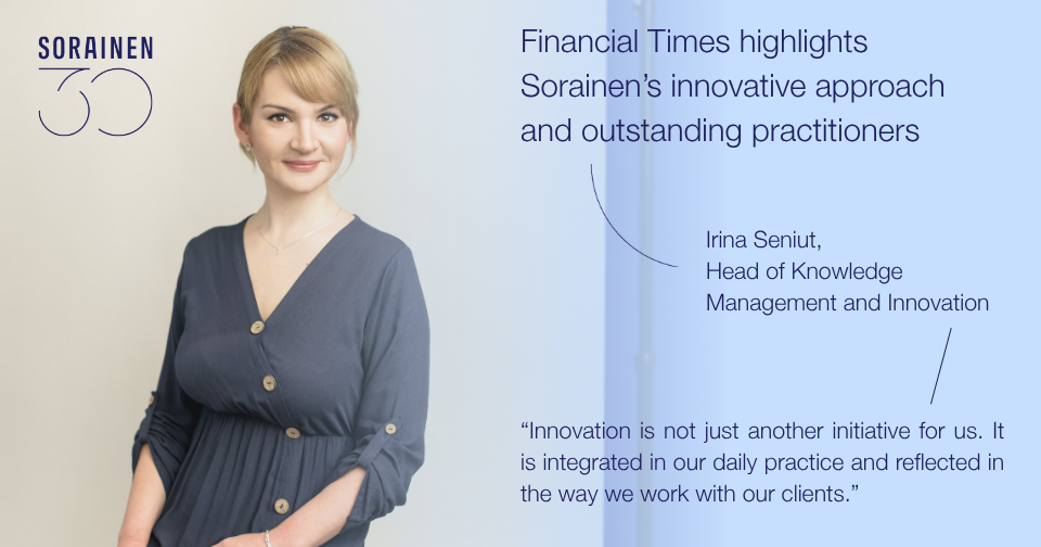 If you want to learn more about Sorainen’s innovations or exchange experiences and practices, please contact Irina Seniut at irina.seniut@sorainen.com.