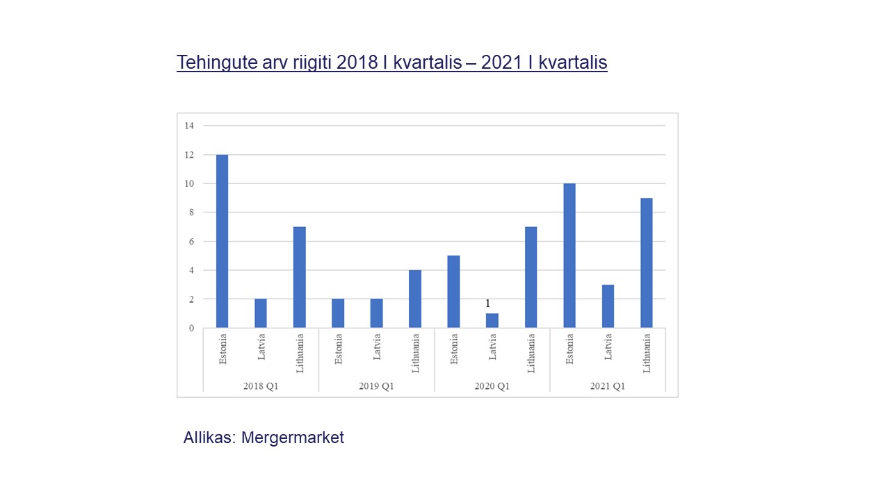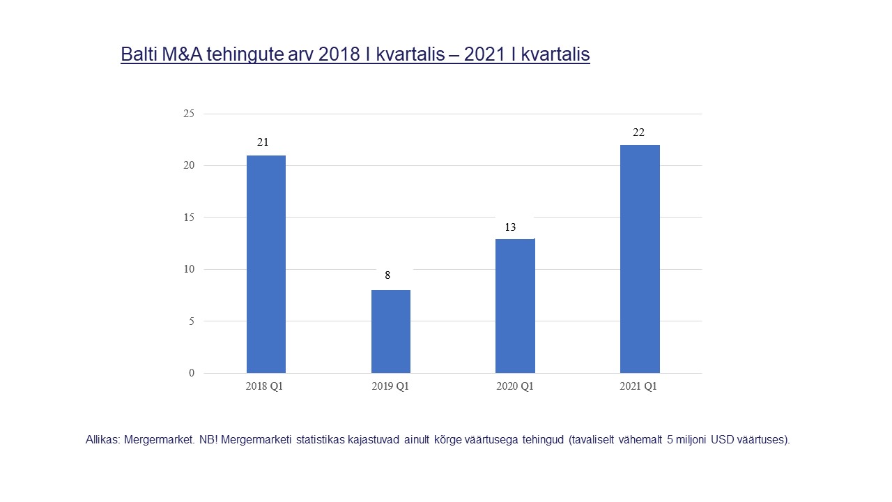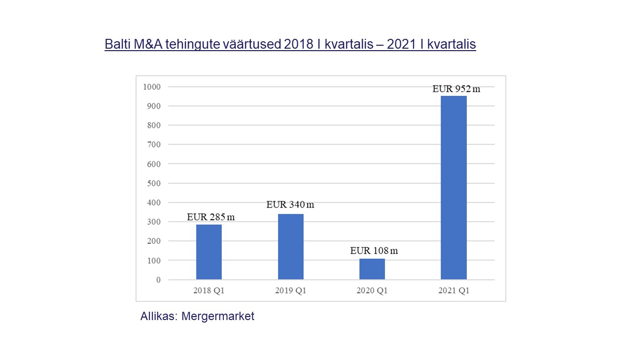 Baltikumi turul näeme sarnasusi globaalsete ja Euroopa trendidega. Nimelt kasvas 2021. a I kvartalis Euroopa M&A turg väärtuse poolest 51,5% võrreldes sama perioodiga eelmisel aastal. Globaalsest turust moodustab Euroopa turg 25,1%. Mergermarketi raporti andmetel küündisid selle aasta I kvartalis globaalsed tehingud 1,16 triljoni USA dollarini, mis tähendab, et see aasta algas ajalooliselt kõrgeima aktiivsusega. Tehinguväärtusedki on viimase 15 aasta kõrgeimad ehk keskmiselt 518,7 dollarit.