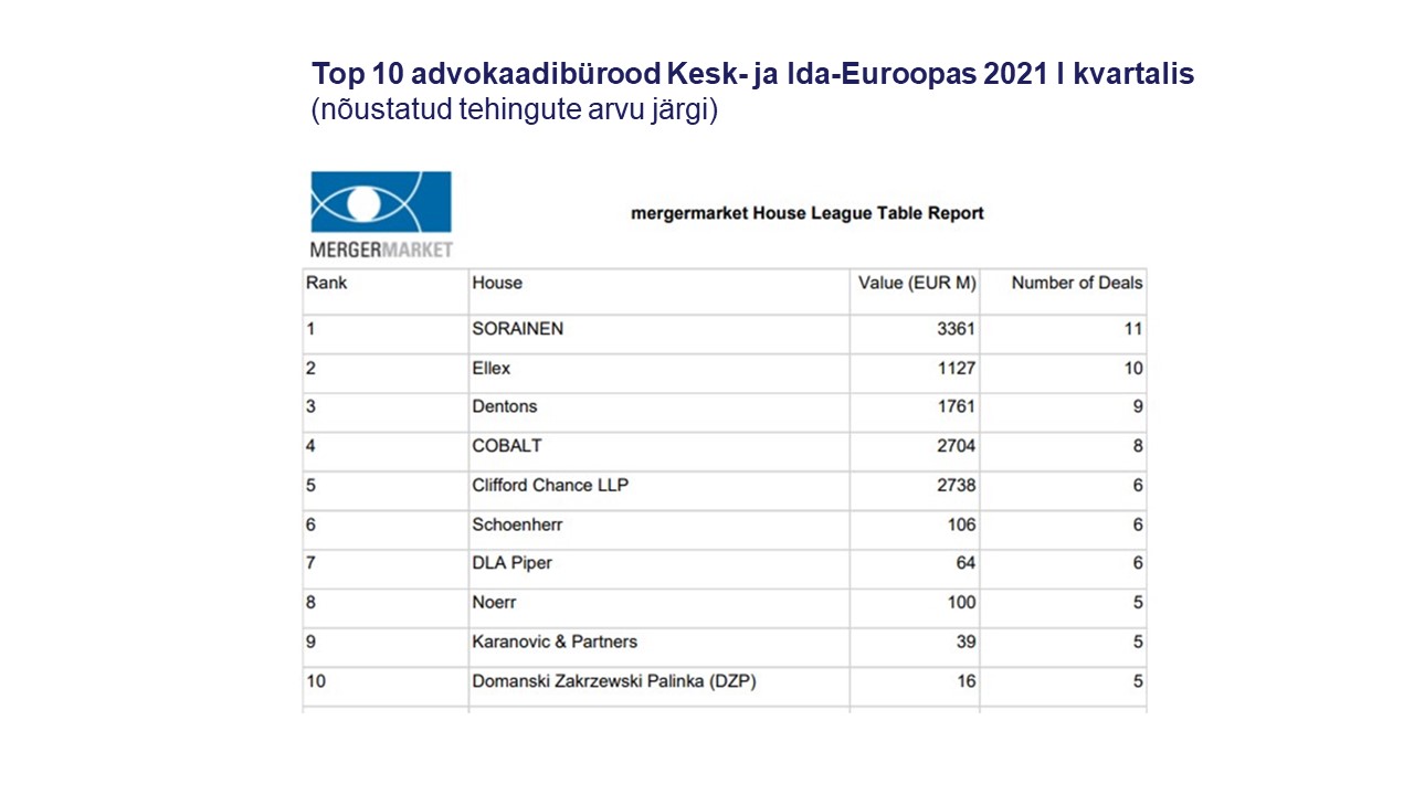Baltikumi aktiivne M&A turg paistab välja ka Mergermarketi õigusnõustajate edetabelis, kus Balti tipp-advokaadibürood troonivad Kesk- ja Ida-Euroopa edetabeli tipus.