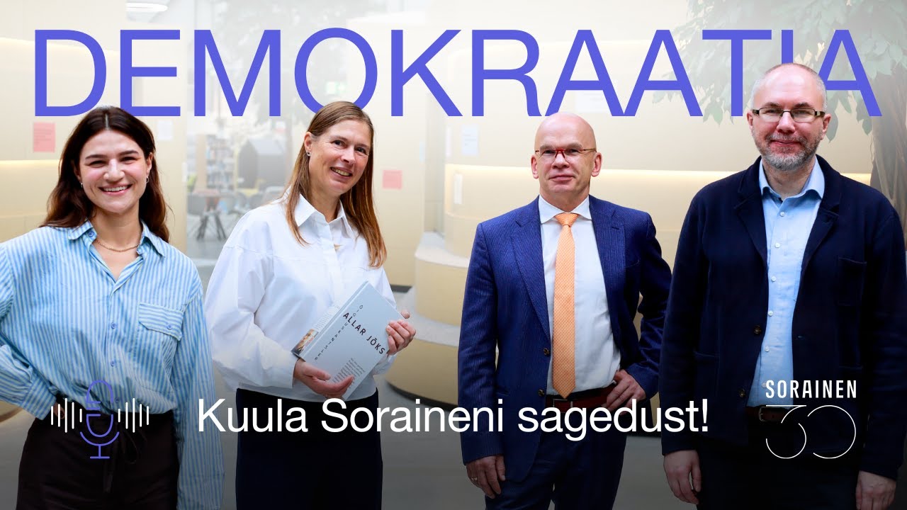 Valimistekuu „Soraineni sageduse“ saates arutleme demokraatia olemuse ja tervise üle nii riigivalitsemises, spordimaailmas kui ka noorte suunamises. Saadet juhivad meie advokaat Helery Maidlas ja vandeadvokaat Mario Sõrm. Saatekülalised on demokraatiavalvurid – endine Eesti Vabariigi president ja praegune Eesti Olümpiakomitee president Kersti Kaljulaid ning meie partner Allar Jõks, kes juhib büroo riigisuhete valdkonda. President Kaljulaidi Fondi ja Soraineni seob koostöö Demokraatia Akadeemiaga, mis on inspireeriv programm 15- kuni 19-aastastele noortele, kes soovivad ühiskonnaelus aktiivsemalt kaasa rääkida. Akadeemia on platvorm Eesti tulevikuliidritele eesmärgiga arendada noorte juhtimisoskusi, kodanikuaktiivust ning arutada Eesti demokraatia käekäigu, poliitika, meedia ja ühiskondlike protsesside üle.