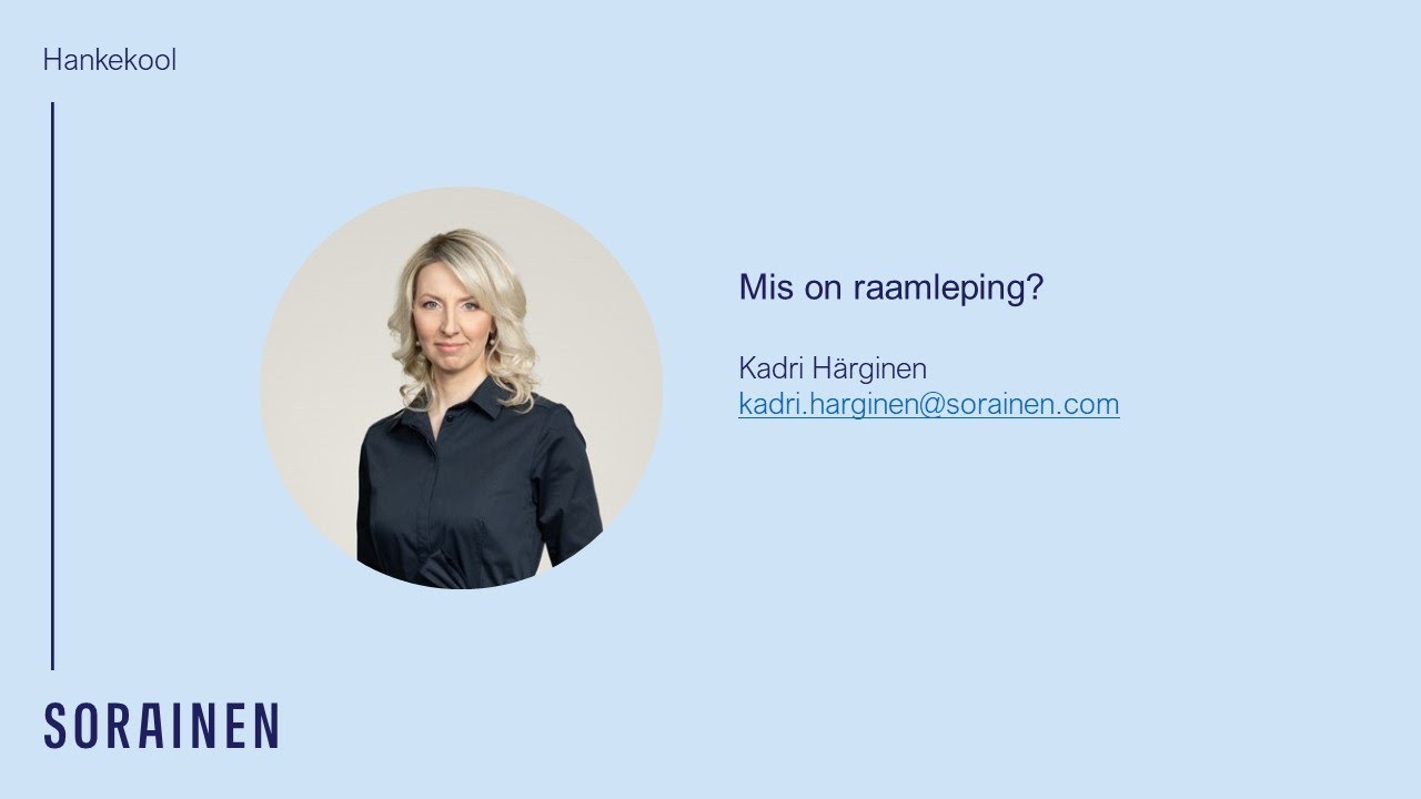 Soraineni hankekooli loengus “Mis on raamleping?” teeb meie riigihankeeksperdist vandeadvokaat Kadri Härginen puust ja punaseks selle, mida kujutab endas riigihanke raamleping: mis on raamlepingu tunnused, kuidas raamlepingut eristada hankelepingust, miks raamlepingut kasutada (ja mitte kasutada), millised nõuded raamlepingule kohalduvad ja palju muud põnevat.