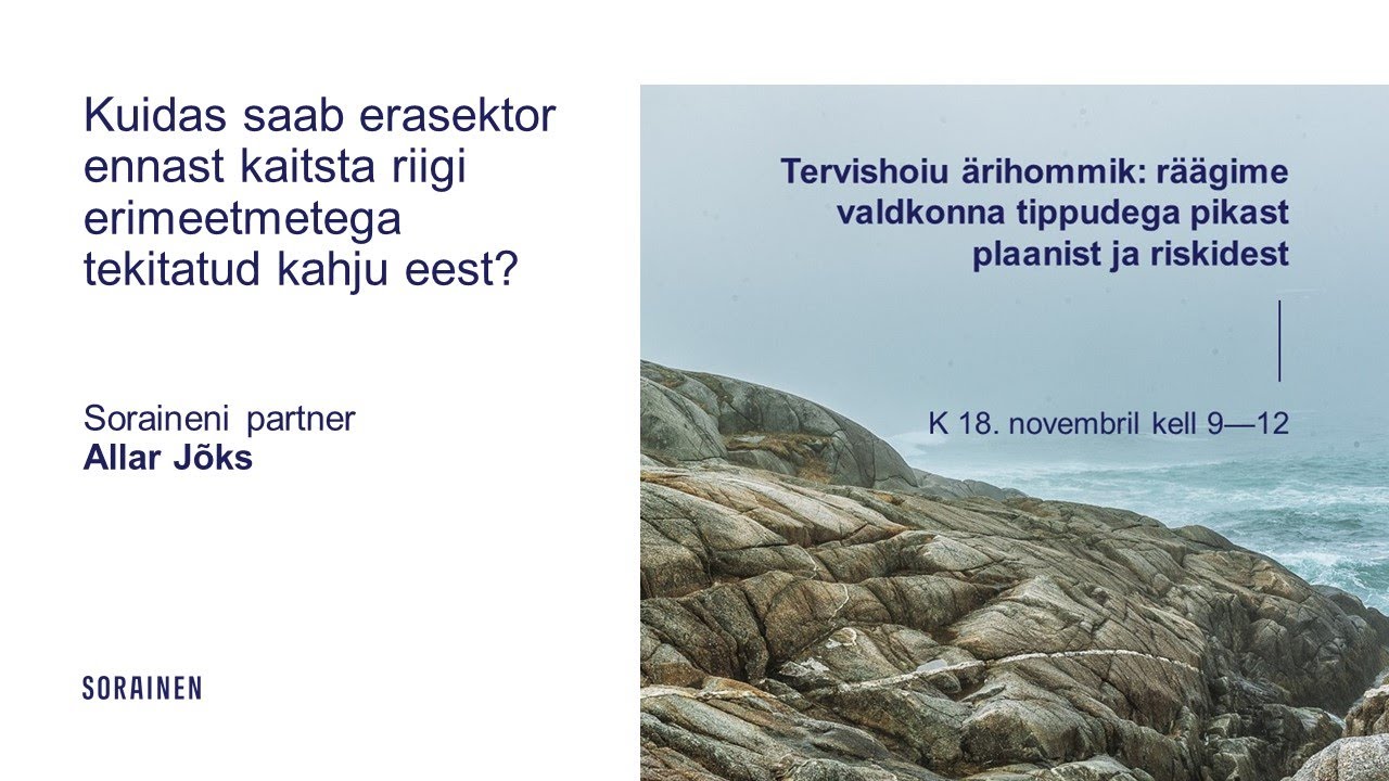 Kuidas saab erasektor ennast kaitsta riigi erimeetmetega tekitatud kahju eest? Video / 30. november 2020 / Allar Jõks Esitab Soraineni partner Allar Jõks Tervishoiu ärihommikul: valdkonna tipud pikast plaanist ja riskidest.