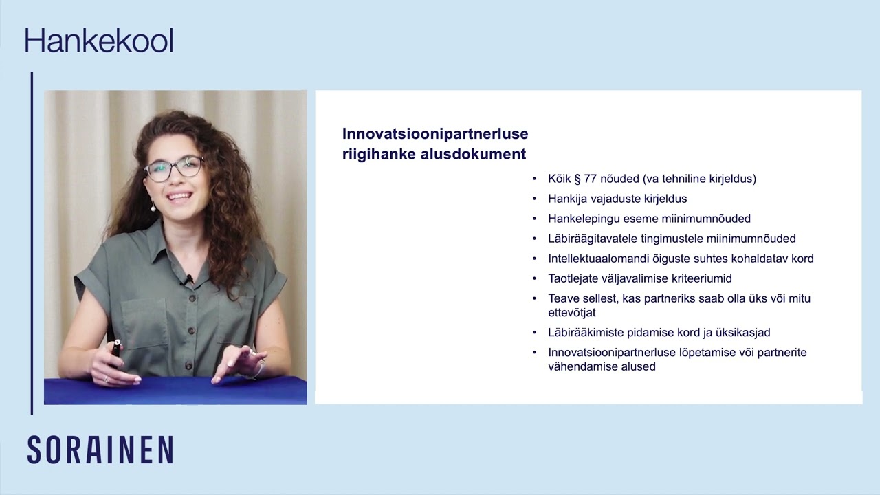 Meie riigihanketiimi vandeadvokaat Gerli Helene Gritsenko annab seekordses Soraineni hankekooli loengus põhjaliku ülevaate innovatsioonipartnerlusest ja selgitab, mida tuleb selle korraldamisel silmas pidada. Gerli räägib nii innovatsioonipartnerluse kasutamise eeldustest kui ka käib läbi selle etapid. Samuti annab soovitusi riigihangete alusdokumentide koostamiseks, sh autoriõigustega seotud tingimuste kehtestamiseks, pakkujate arvu piiramiseks, hindamiskriteeriumide seadmiseks ja hankelepingu tingimuste kehtestamiseks ning läbirääkimiste pidamiseks.