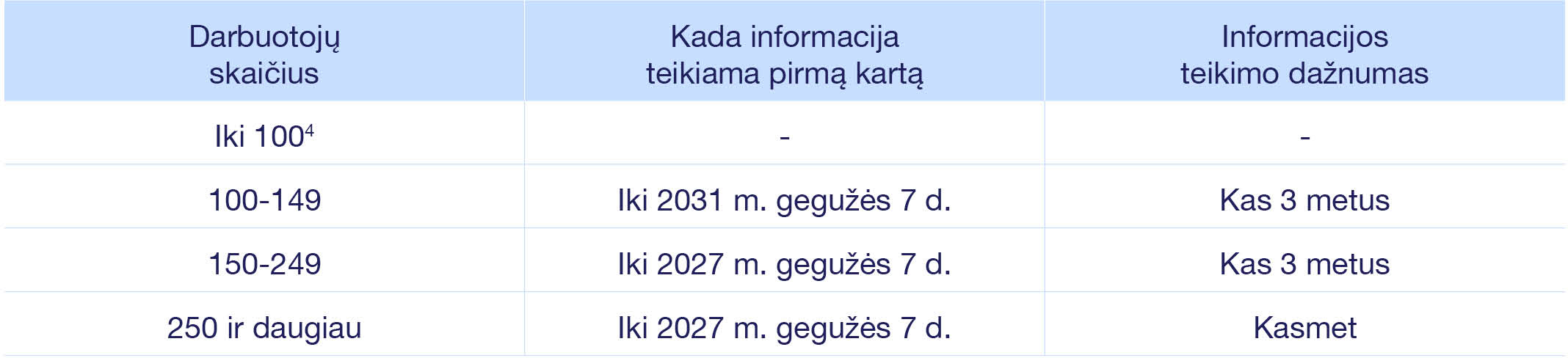 ⁴ Darbo kodeksas numato galimybę darbdaviams, turintiems mažiau nei 100 darbuotojų, savanoriškai dalyvauti vyrų ir moterų darbo užmokesčio skirtumo informacijos rengime (tokiu atveju taikomi tokie patys terminai, kaip ir 100-149 darbuotojų turinčioms įmonėms).