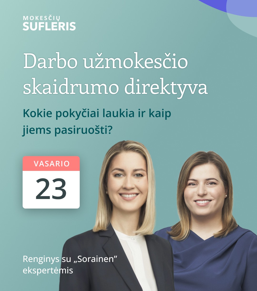 Praktinėmis žiniomis dalinsis „Sorainen“ Darbo teisės komandos vadovė Agnietė Venckienė ir ekspertė Aurelija Daubaraitė, kurios yra sukaupusios reikšmingą patirtį atlygio sistemų rengimo, vertinimo bei su pokyčiais susijusių ginčų srityse.