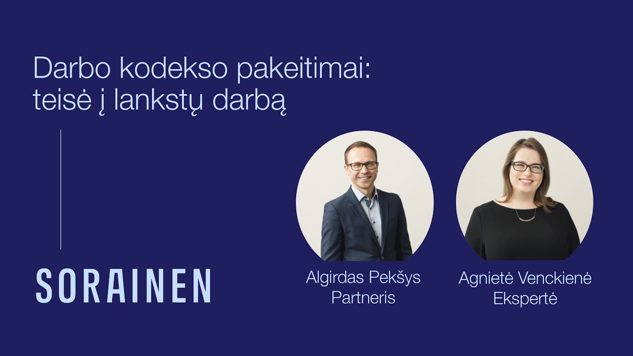 Naujoji Darbo kodekso redakcija įtvirtino reikšmingus pakeitimus, susijus ir su lanksčiomis darbo sąlygomis bei mobingu. 2022 m. spalio 4 d. vykusiame internetiniame seminare „Darbo kodekso pakeitimai: teisė į lankstų darbą ir pareiga spręsti mobingo problemas“ juos apžvelgė „Sorainen“ Darbo teisės komanda.