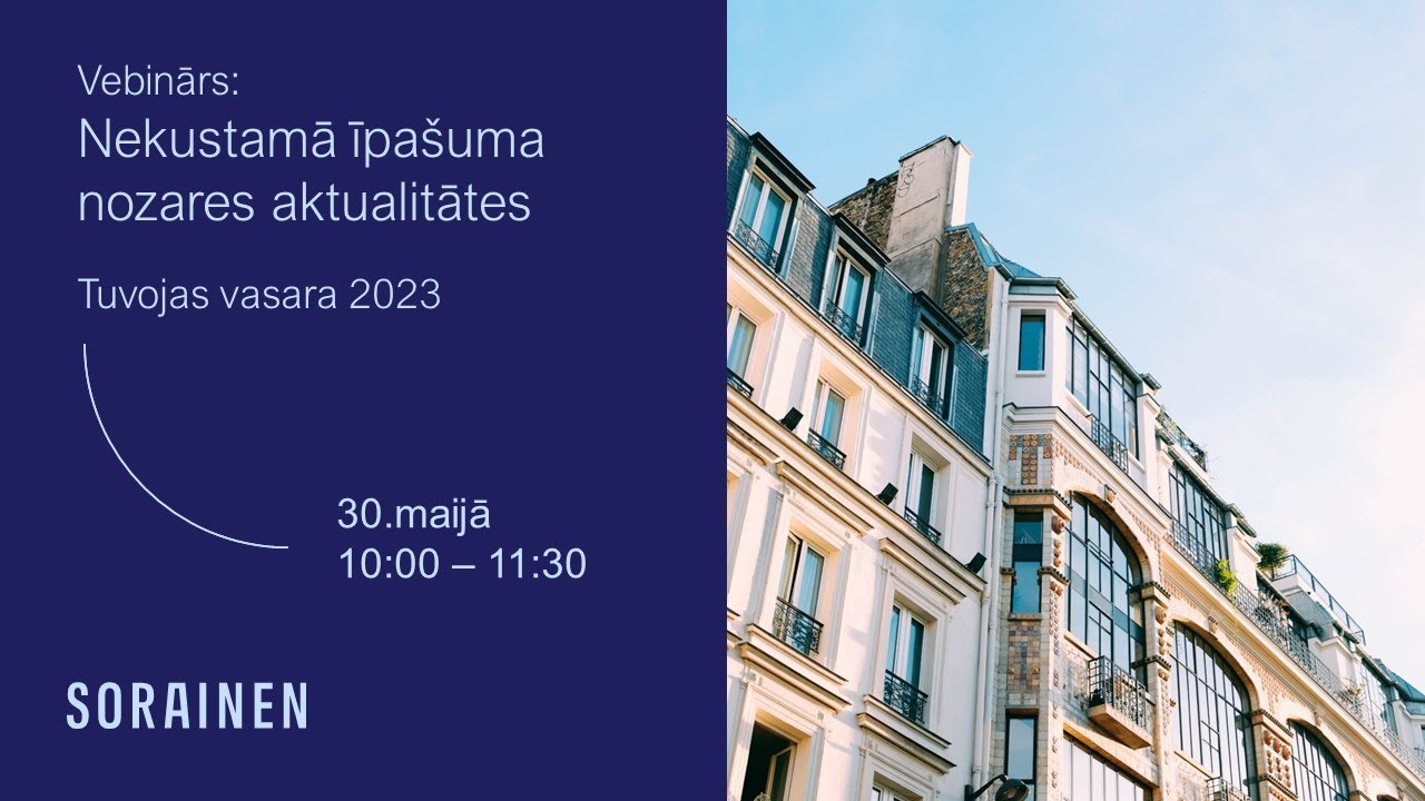 Šoreiz Sorainen nekustamā īpašuma un būvniecības sektora grupas pārstāvji kopā ar kolēģi no vadoša nekustamā īpašuma pakalpojumu un investīciju pārvaldīšanas uzņēmuma Colliers aicina Jūs tuvāk iepazīt šādas nozares aktualitātes: