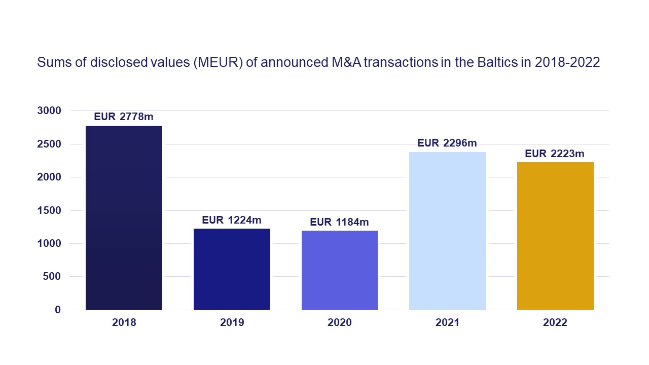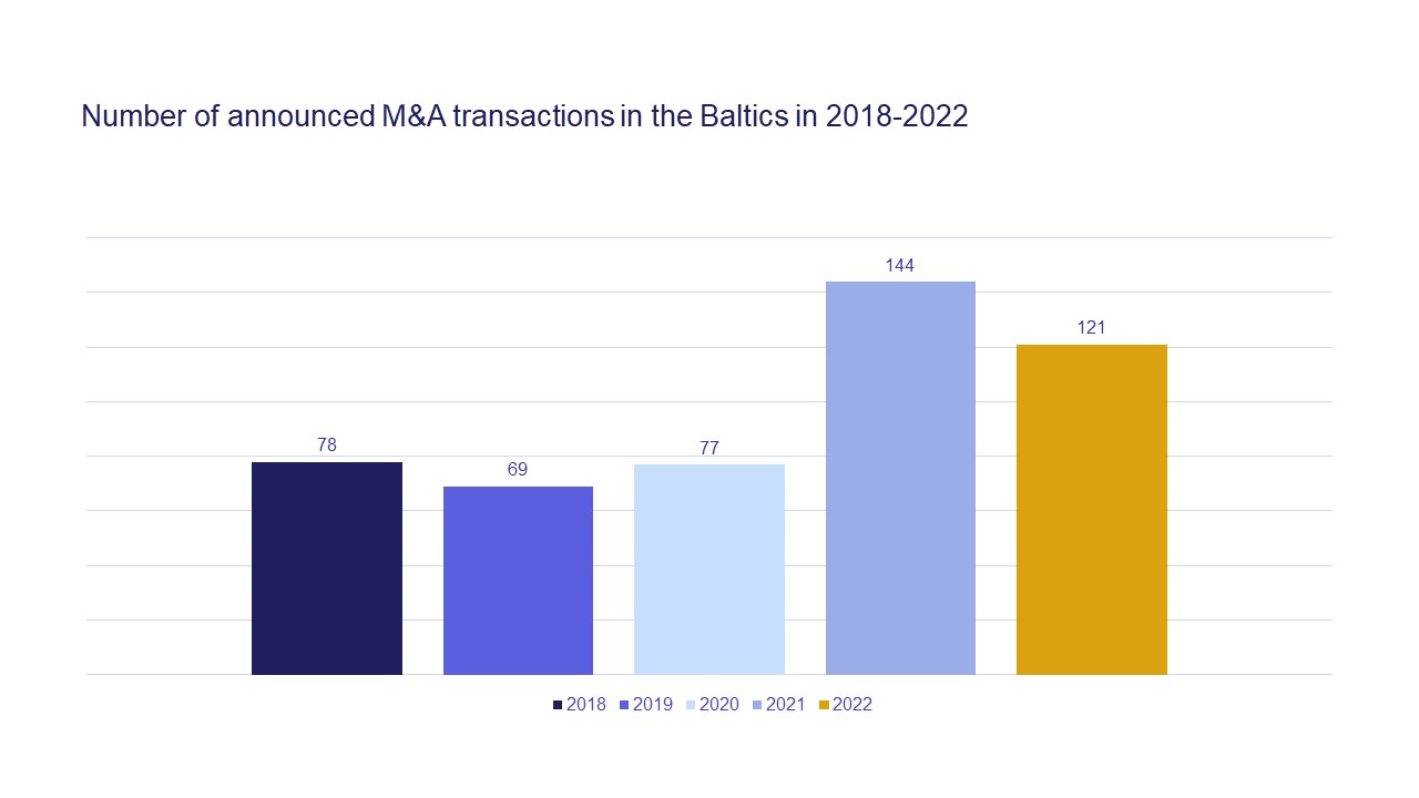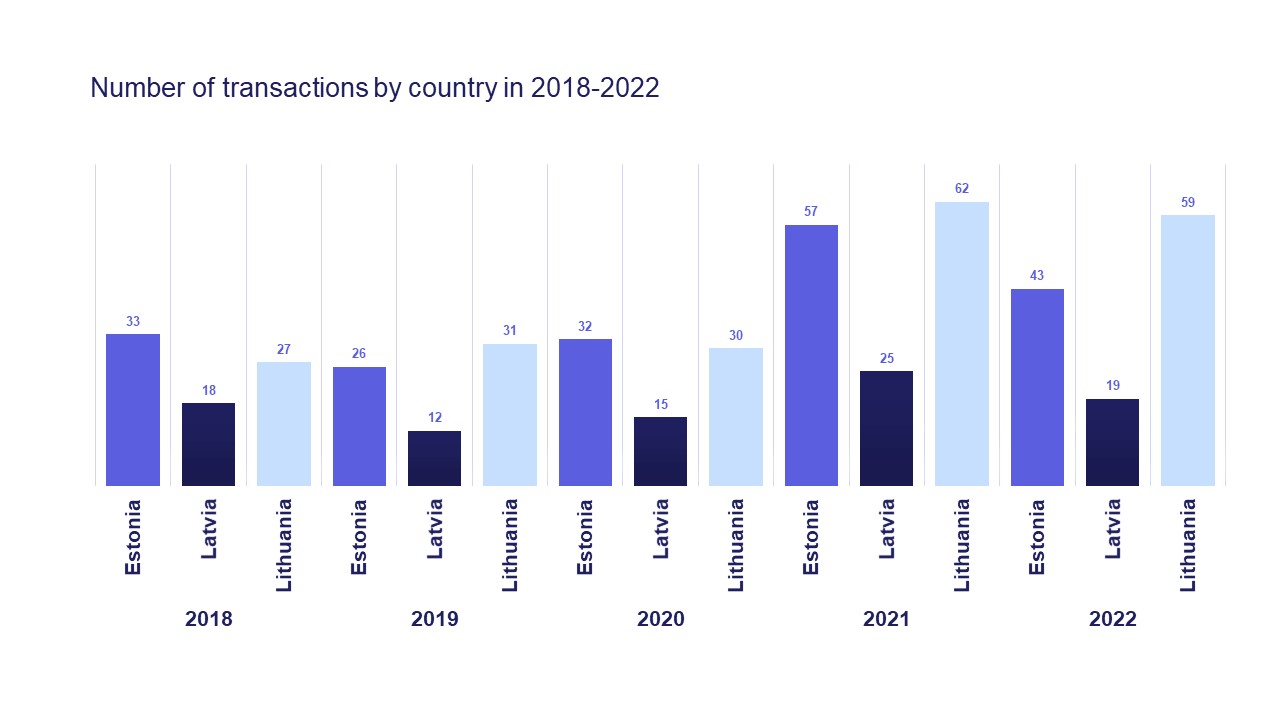 Note: Our analysis is based on statistics from the international M&A intelligence, data and research tool Mergermarket. We note that Mergermarket statistics include only higher-value transactions (normally those exceeding USD 5 million) and therefore the overall number of transactions in the Baltics was higher than is shown in the statistics (which do not include lower-value transactions). In the Mergermarket database, transactions are allocated between countries based on the “deal dominant geography” criteria. The data is taken from the database as of 10 January 2023.
