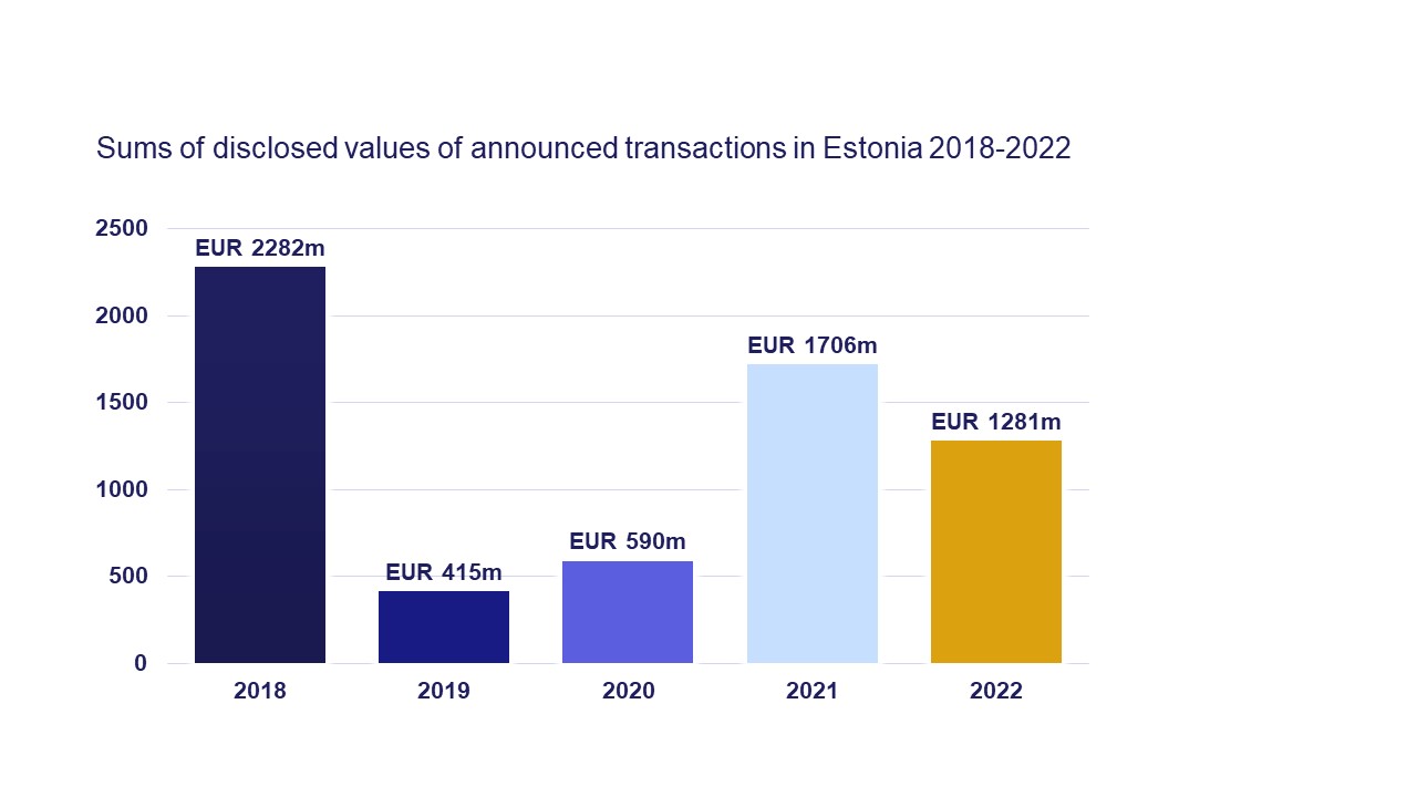 The M&A deal market in Estonia started 2022 with a bang when Estonian startups raised a total of EUR 1 billion in capital within the first four months of the year. On the frontline of raising capital was Bolt, the fastest-growing mobility platform in the world, raising EUR 628 million in the biggest funding round in the Baltics’ history. However, the startup sector slowed down significantly, both in terms of fundraising and exits, starting from Q2 until the end of the year, which is a direct result of a global crash in tech stock, a decline in capital markets and Russia’s war in Ukraine, which affected valuations and increased inflationary pressures.