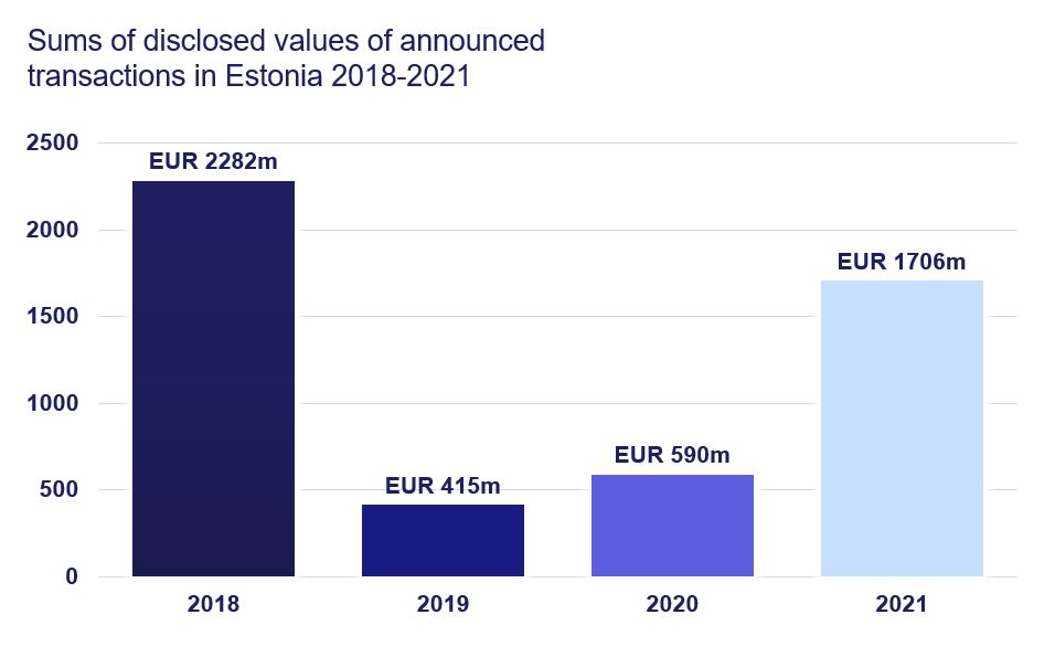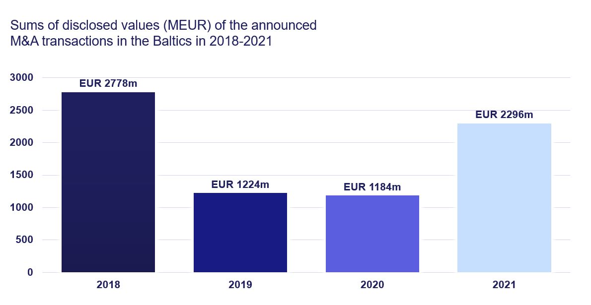 The market has clearly recovered from the slump at the beginning of the pandemic. However, while the deal values in 2021 were significantly higher than in 2020, they remained below the record level of 2018 (EUR 2,296 million in 2021 compared to EUR 2,778 million in 2018), which was a special year of remarkable M&A deals in the Baltics. There has been a clear jump (almost a doubling) from the 2019 and 2020 deal value level (from EUR 1,184 million in 2020 to EUR 2,296 million in 2021)