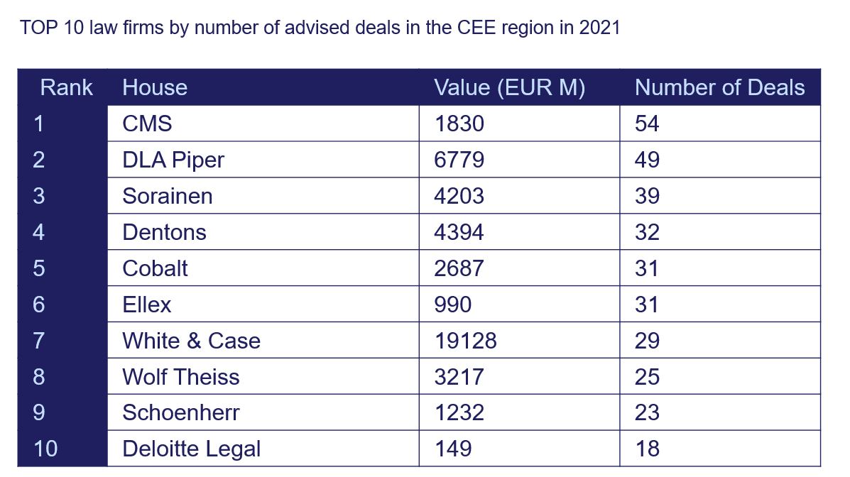 In 2021, the Baltic M&A and private equity market demonstrated record activity, with the number of announced deals growing by 51% compared to 2020 and also surpassing deal activity levels in all previous years, including those preceding the start of the pandemic. As a result, we can find leading Baltic law firms among the top 6 positions on the Central and Eastern European advisor leaderboards, side-by-side with global legal market heavyweights. This shows that the Baltic investment climate has been favourable to investors.